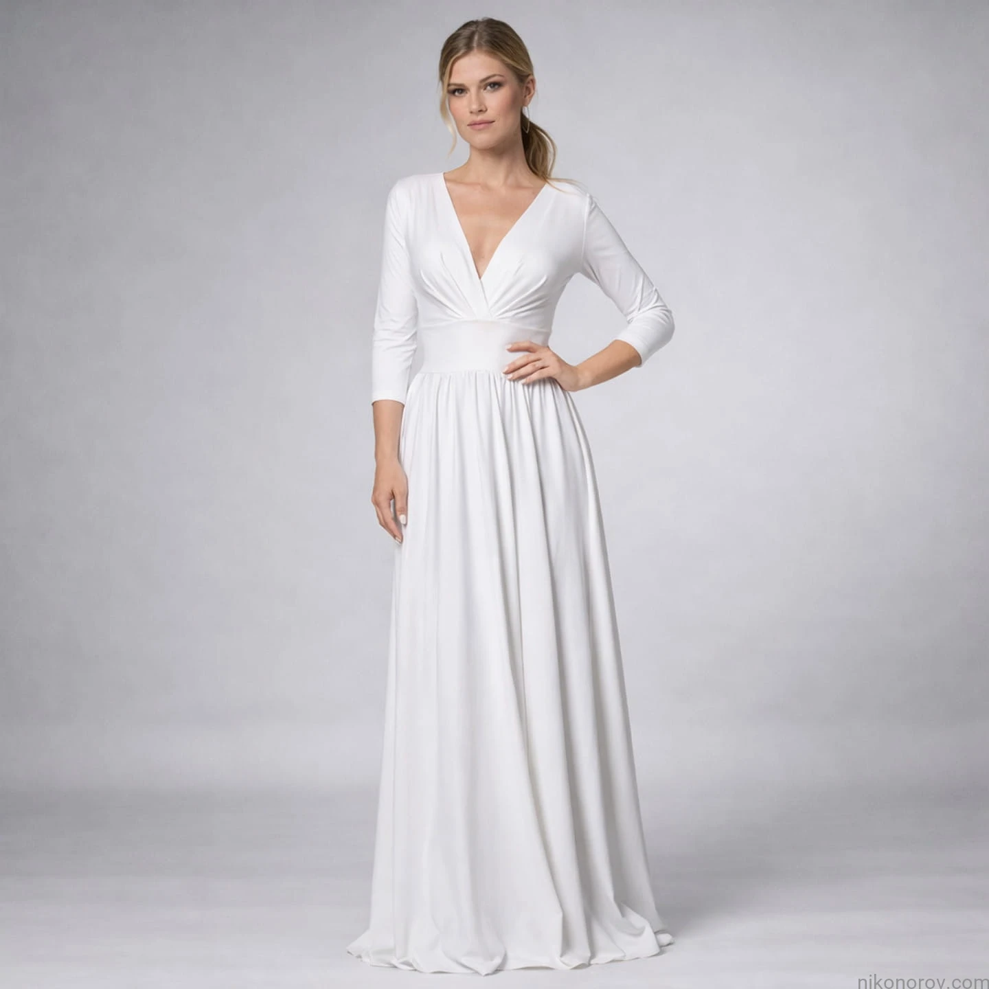 Rada: "Megan" jest idealna dla kobiet o różnych rozmiarach i typach sylwetek. Mniejszy biust wydaje się w niej pełniejszy, większy jest podkreślony - to dzięki zakładkom i odpowiedniej długości dekoltu. Suknia ta maskuje biodra. pośladki, uda - możesz ją założyć, jeśli twoja dolna część sylwetki jest w większym rozmiarze niż górna. Jedynym warunkiem, jaki twoja sylwetka musi spełnić to zaznaczona talia.